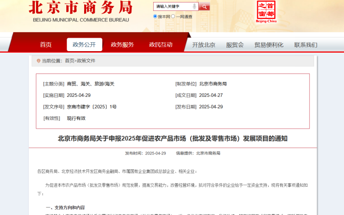 《北京市商务局关于申报2025年促进农产品市场(批发及零售市场)