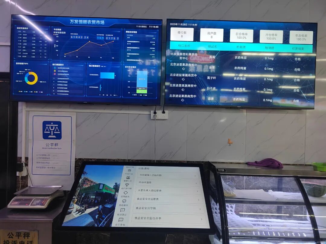 万发恒顺菜市场约600平方米,日均客流量1000左右。作为全市首批智慧农贸市场试点之一,今年8月29日,万发恒顺菜市场智能电子秤、信息显示屏、导购智能屏、电子价签等数字化系统及设施正式投入使用,成为西城区首家实现“智慧监管+云端服务”的示范市场。加装的智慧设施解决了客户采购的后顾之忧,避免了缺斤少两的问题,同时实现了产地溯源。当日菜市场的快检结果、销量及满意度等数据也可在电子屏上轻松查询。